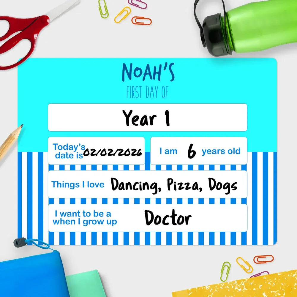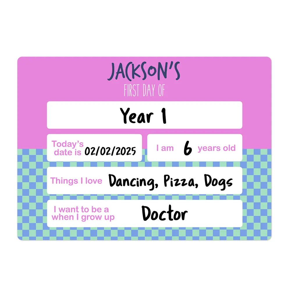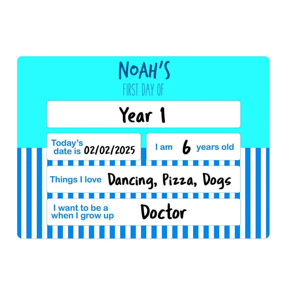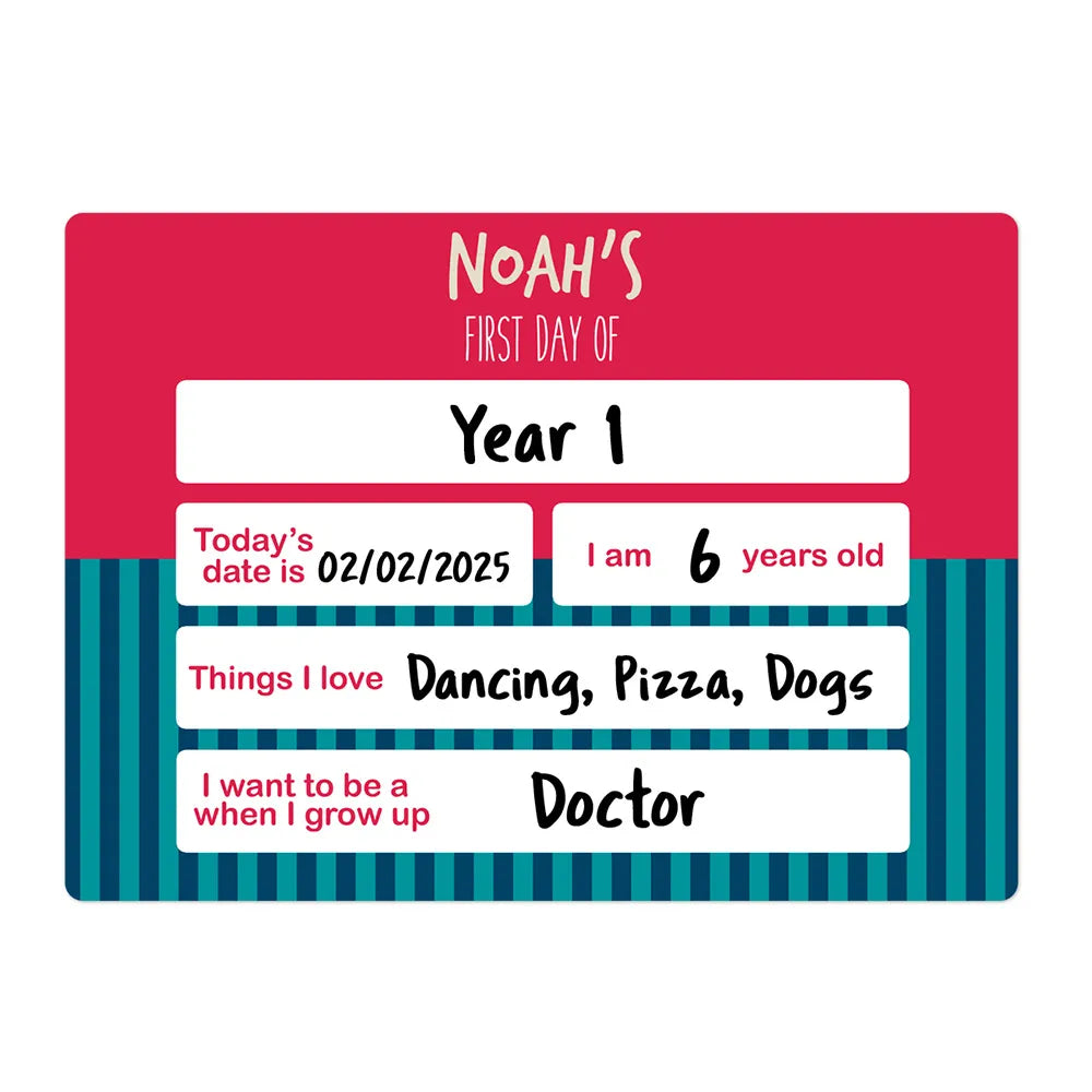 Make your child's first day of school extra special with our personalised sign. This adorable and customisable prop is perfect for capturing precious memories. Featuring a bright and colourful designs, the sign can be personalised with your child's name and grade. Create a lasting keepsake that you can cherish for years to come.