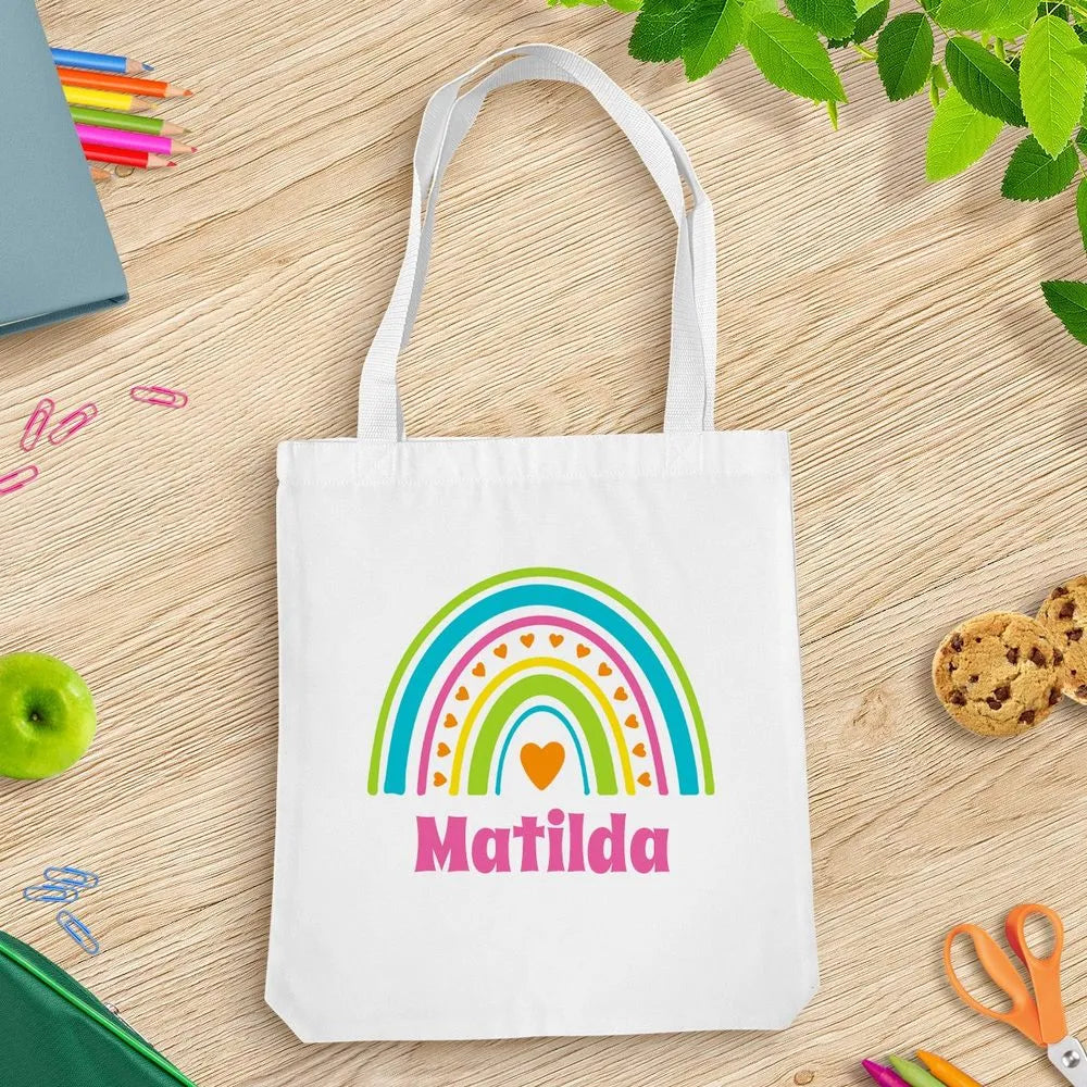 Make your child's tote bag truly unique with our personalised option! Perfect for school, daycare, or everyday adventures, our tote bags are crafted from durable white canvas and feature reinforced handles for carrying heavy items with ease. The long handles make it comfortable to carry over the shoulder.