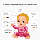 Add name, gender, hair colour, hair style, eye colour, skin tone & select onesie colour