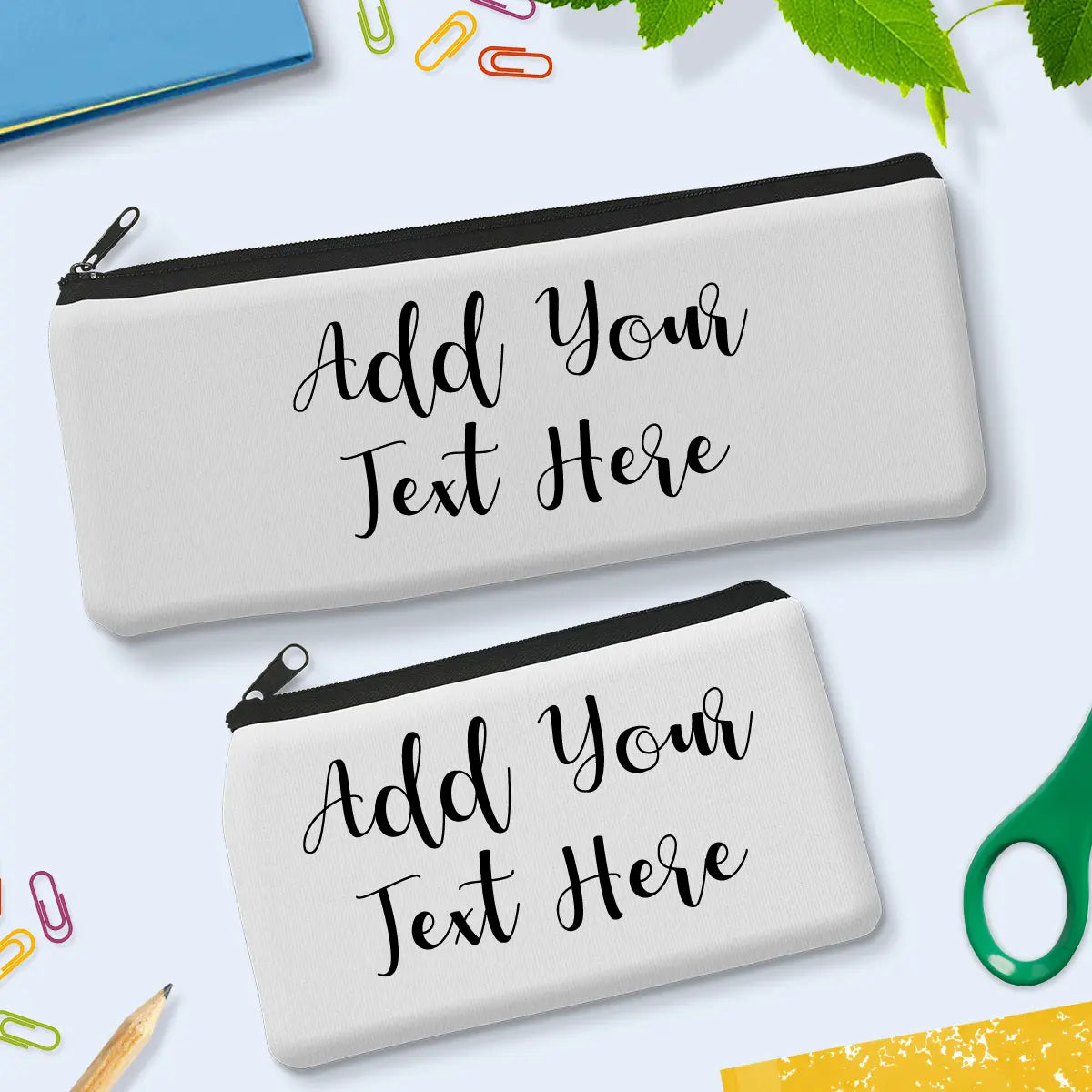 Our pencil cases come in two sizes: small or large. Design is printed on both sides. Pencil cases are made from durable neoprene material with a zip at the top.