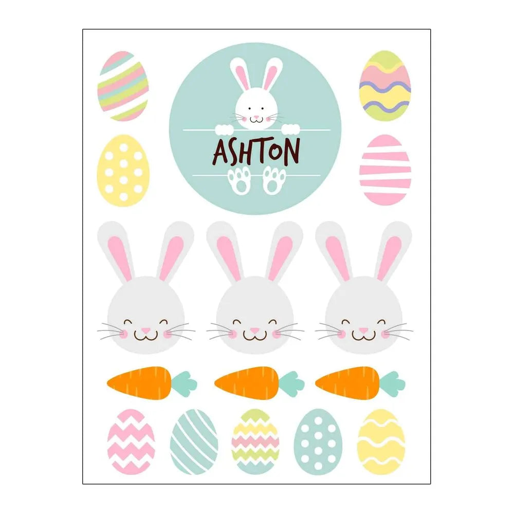 Create your own personalised Easter bucket for your kids or use them for scrapbooking or making Easter cards. Pack includes one large personalised round sticker, 3 bunnies, 3 carrots and 8 eggs. 16 stickers in total per sheet.