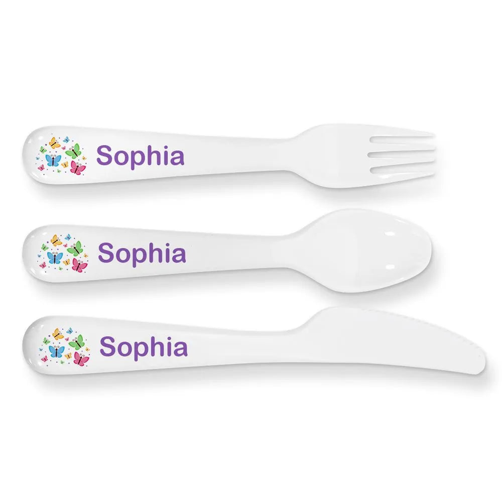 Our personalised melamine kids' cutlery set is made from a durable high gloss plastic. Inspect product before each use and dispose of at the first sign of damage or weakness.