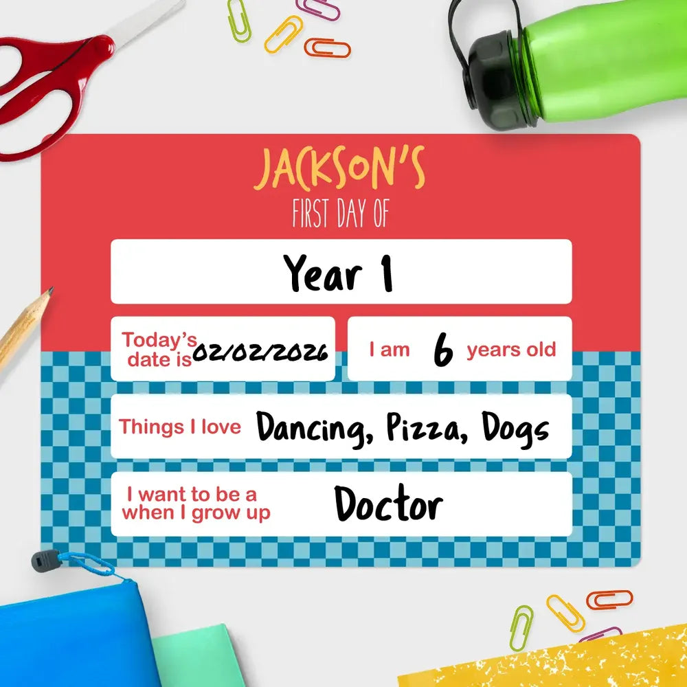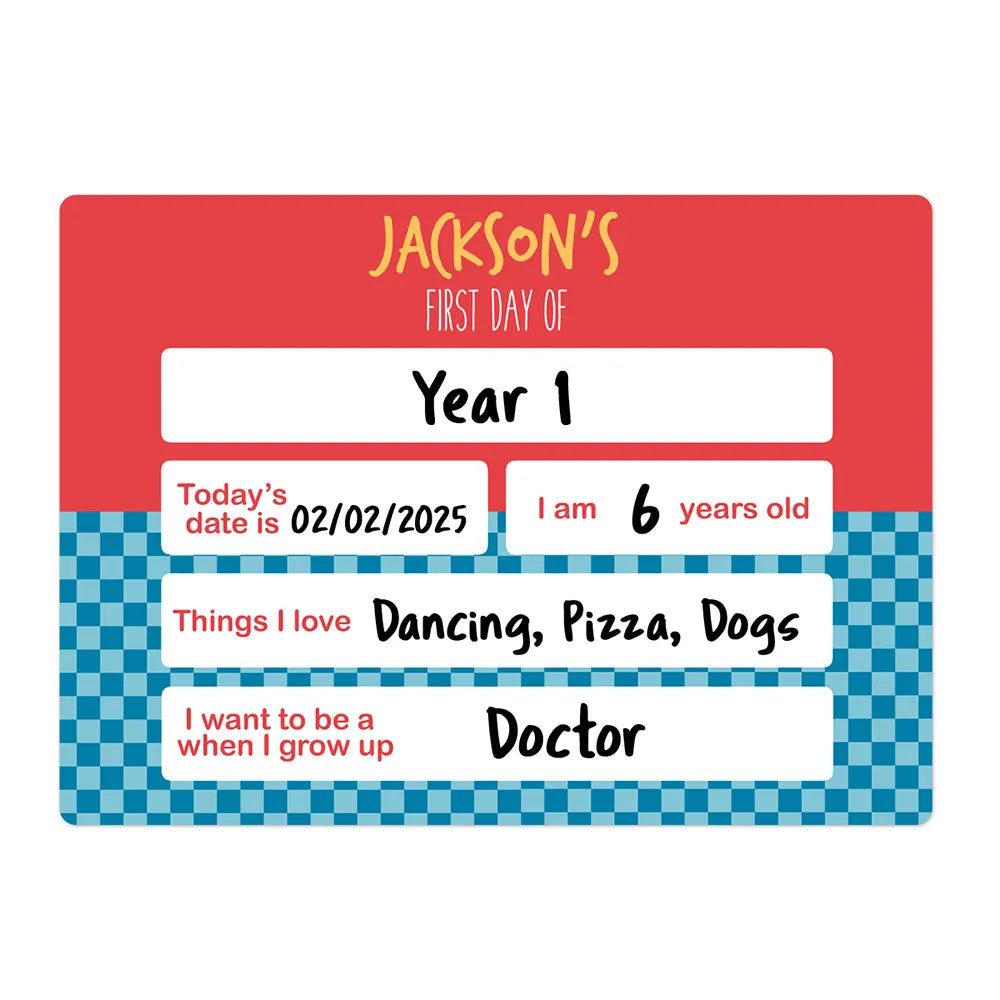 First Day Signs are the perfect way to celebrate and capture all of their First Day milestones as they grow. Personalise with their name and choose from our variety of designs. Write on it with a dry erase marker and then simply wipe it clean and you're ready for next time!