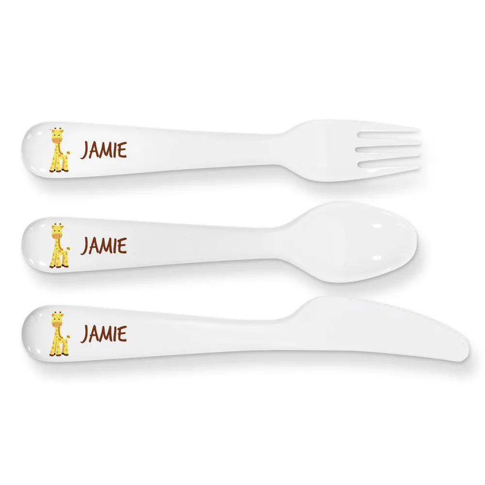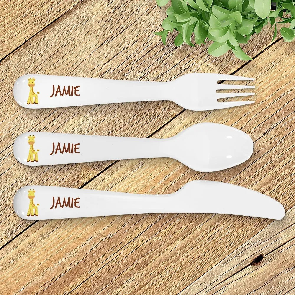 Our personalised melamine kids' cutlery set is made from a durable high gloss plastic. Inspect product before each use and dispose of at the first sign of damage or weakness.