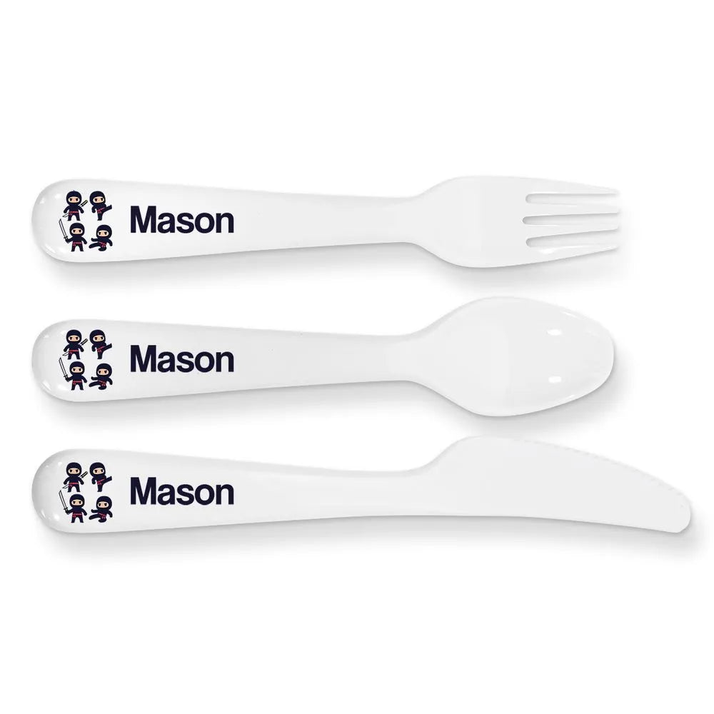 Our personalised melamine kids' cutlery set is made from a durable high gloss plastic. Inspect product before each use and dispose of at the first sign of damage or weakness.