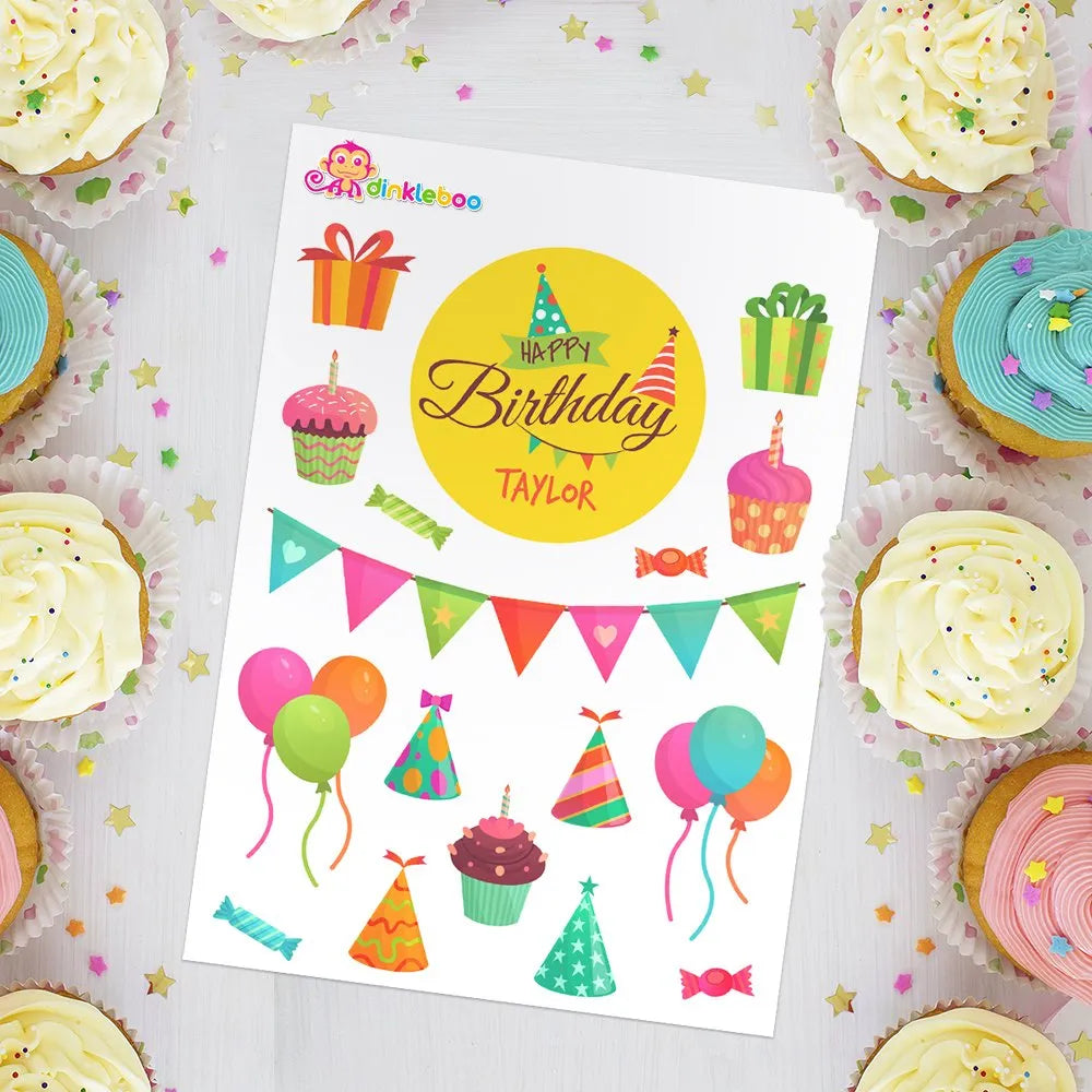 All kids love stickers? Pack includes one large personalised round sticker, 4 party hats, 4 lollies, 3 cupcakes, 2 balloons, 2 presents, and 1 bunting. 17 stickers in total per sheet.