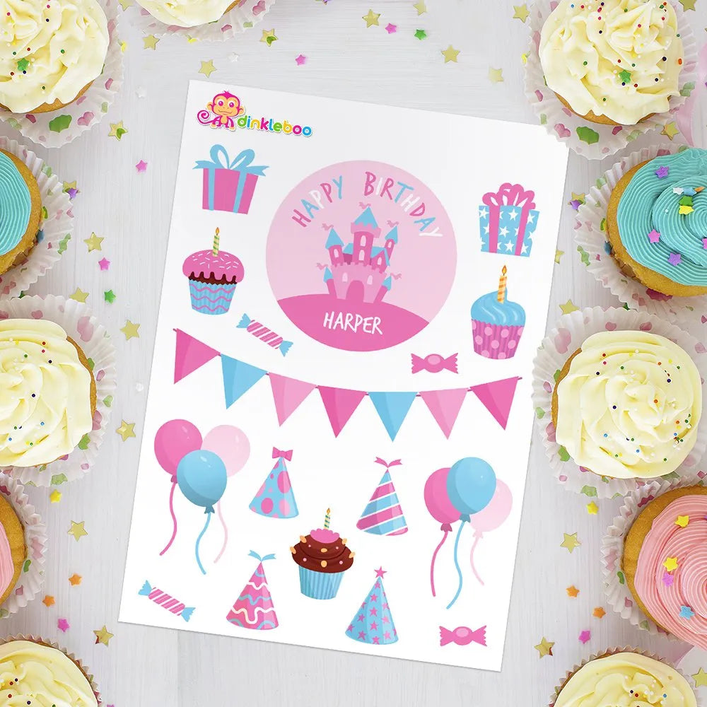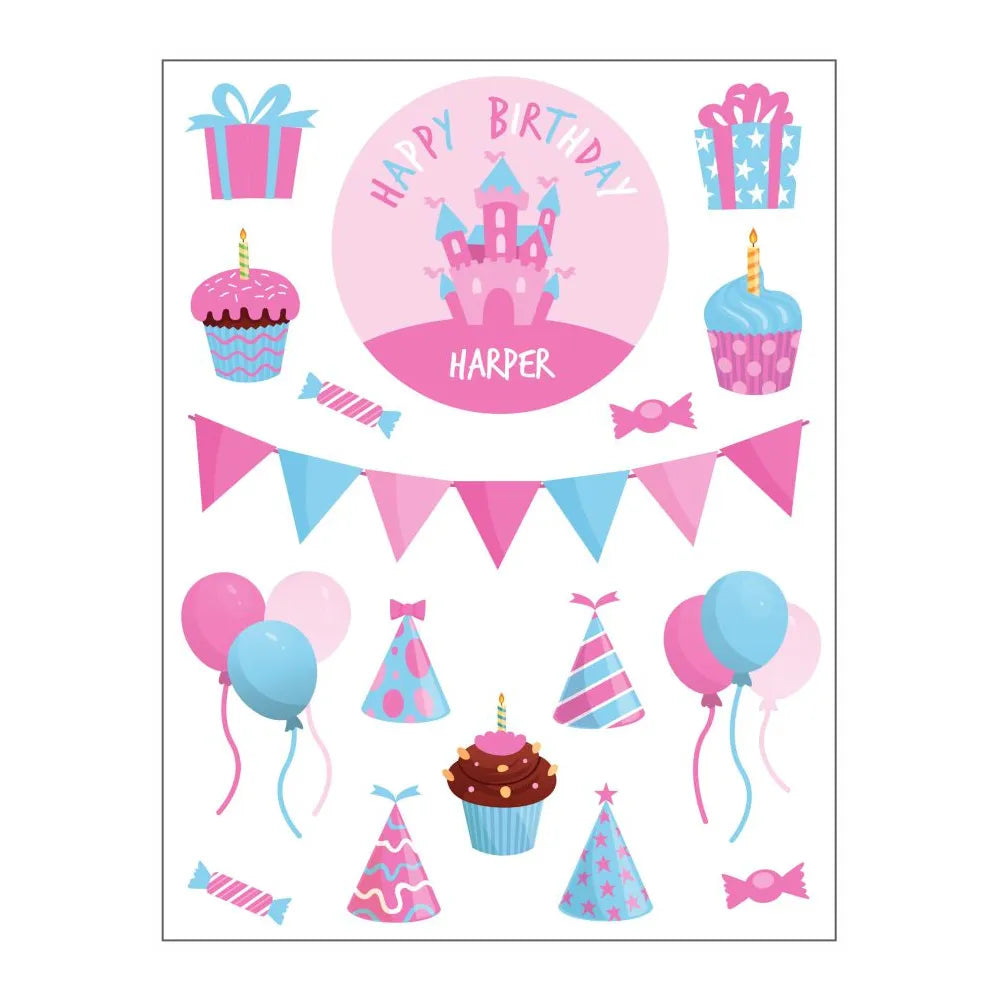 All kids love stickers? Pack includes one large personalised round sticker, 4 party hats, 4 lollies, 3 cupcakes, 2 balloons, 2 presents, and 1 bunting. 17 stickers in total per sheet.