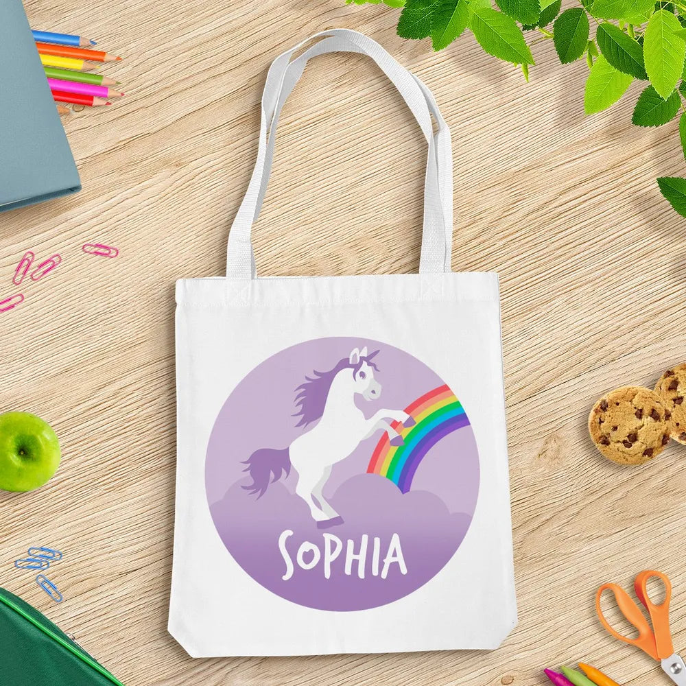 The perfect bag for home or school, personalised with your own name on it. Simply choose your favourite design, then personalise with your name. Made from heavy-duty white canvas material. Each tote bag has reinforced handles that can carry heavy items, like books and school supplies with ease. The long handles make it easy to carry over your shoulder.