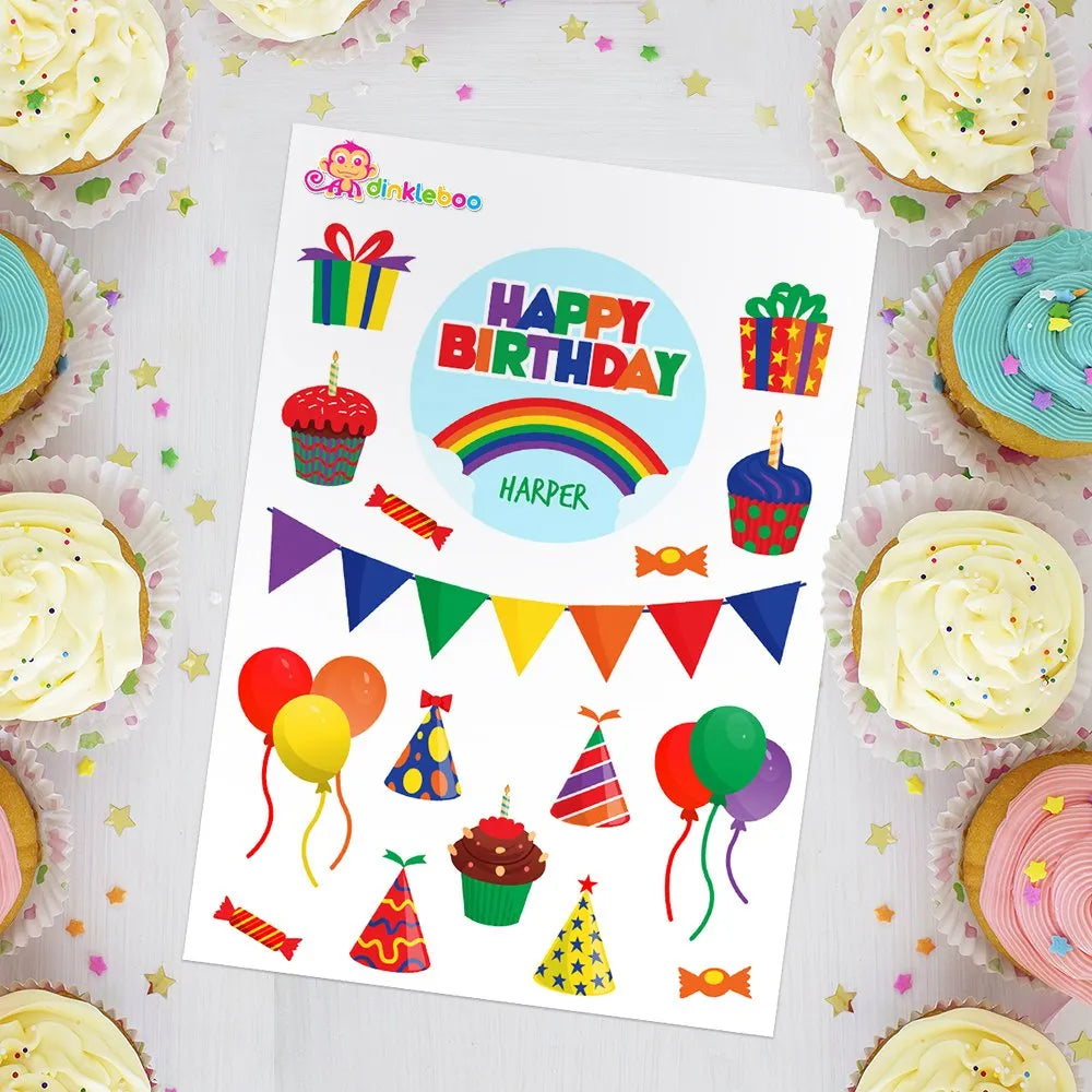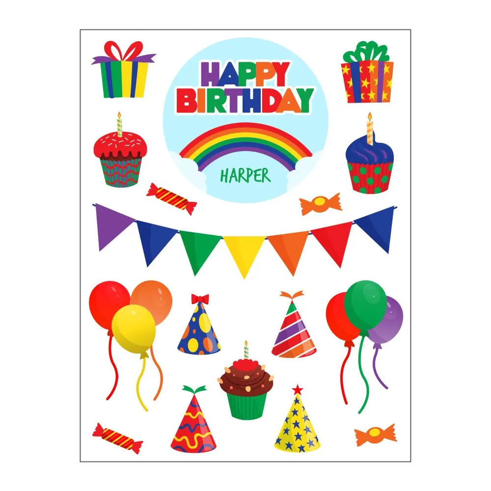 All kids love stickers? Pack includes one large personalised round sticker, 4 party hats, 4 lollies, 3 cupcakes, 2 balloons, 2 presents, and 1 bunting. 17 stickers in total per sheet.