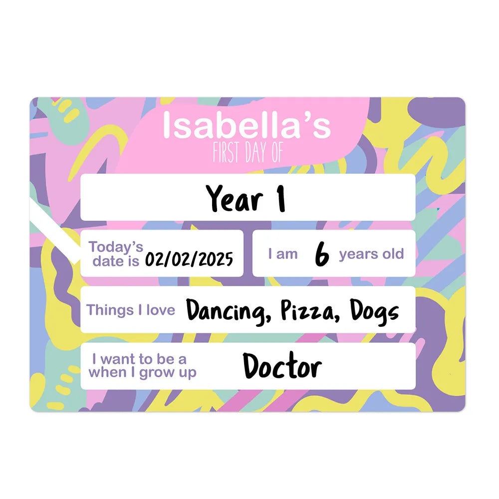 First Day Signs are the perfect way to celebrate and capture all of their First Day milestones as they grow. Personalise with their name and choose from our variety of designs. Write on it with a dry erase marker and then simply wipe it clean and you're ready for next time!