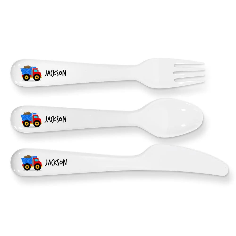 Our personalised melamine kids' cutlery set is made from a durable high gloss plastic. Inspect product before each use and dispose of at the first sign of damage or weakness.